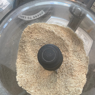 1. In a food processor fitted with the metal blade, add oats, flaxseed meal, chickpea flour, coconut. Process until all ingredients are finely chopped, about 1 minute.